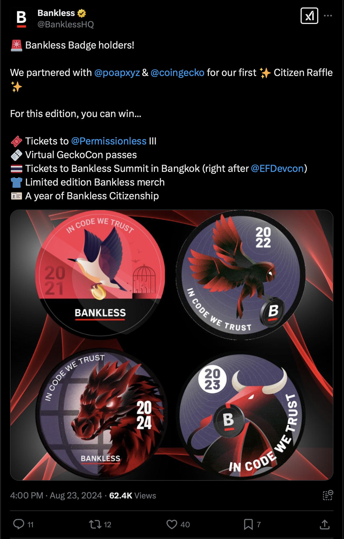 Bankless held an X Space in partnership with CoinGecko, who sponsored the prizes as a way to be visible in the Bankless community. Bankless members could tune in on X spaces to watch the raffle happen live, see prizes, and hear about the plans both communities had for the near future.